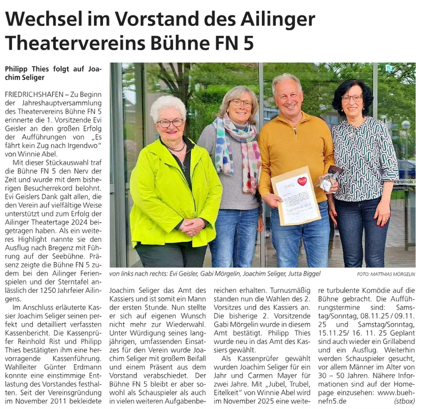 Premiere von „Menschen, Nachbarn, Katastrophen“ ist am 14. November um 20 Uhr. Weitere Aufführungen im Gemeindehaus Berg am 16. November um 16.30 Uhr sowie am 21. und 22. November jeweils um 20 Uhr. Karten im Vorverkauf gibt es für 8 Euro im Rathaus Ailingen und bei Elektro Lorch. Karten an der Abendkasse kosten 9 Euro. Die Plätze sind nummeriert.